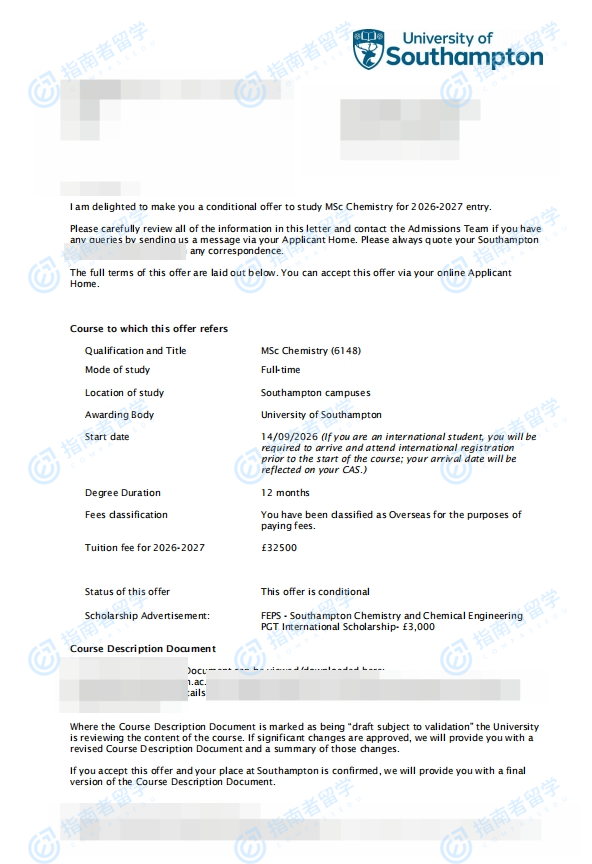 南安普顿大学高级化学工程理学硕士研究生offer一枚