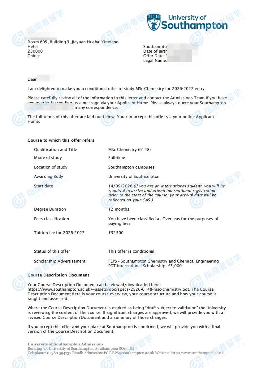 具有2:1学位或同等学历,需要化学背景,或包含至少30%的化学含量,不包括基于实验室的课程,并且化学课程平均成绩为2:1<br> 如果申请者未明确满足申请要求但在该领域有丰富的工作经验,学校会评估其相关专业经验、学科知识和学习能力,申请将根据个人成绩进行考虑,申请者可能会被要求参加面试
