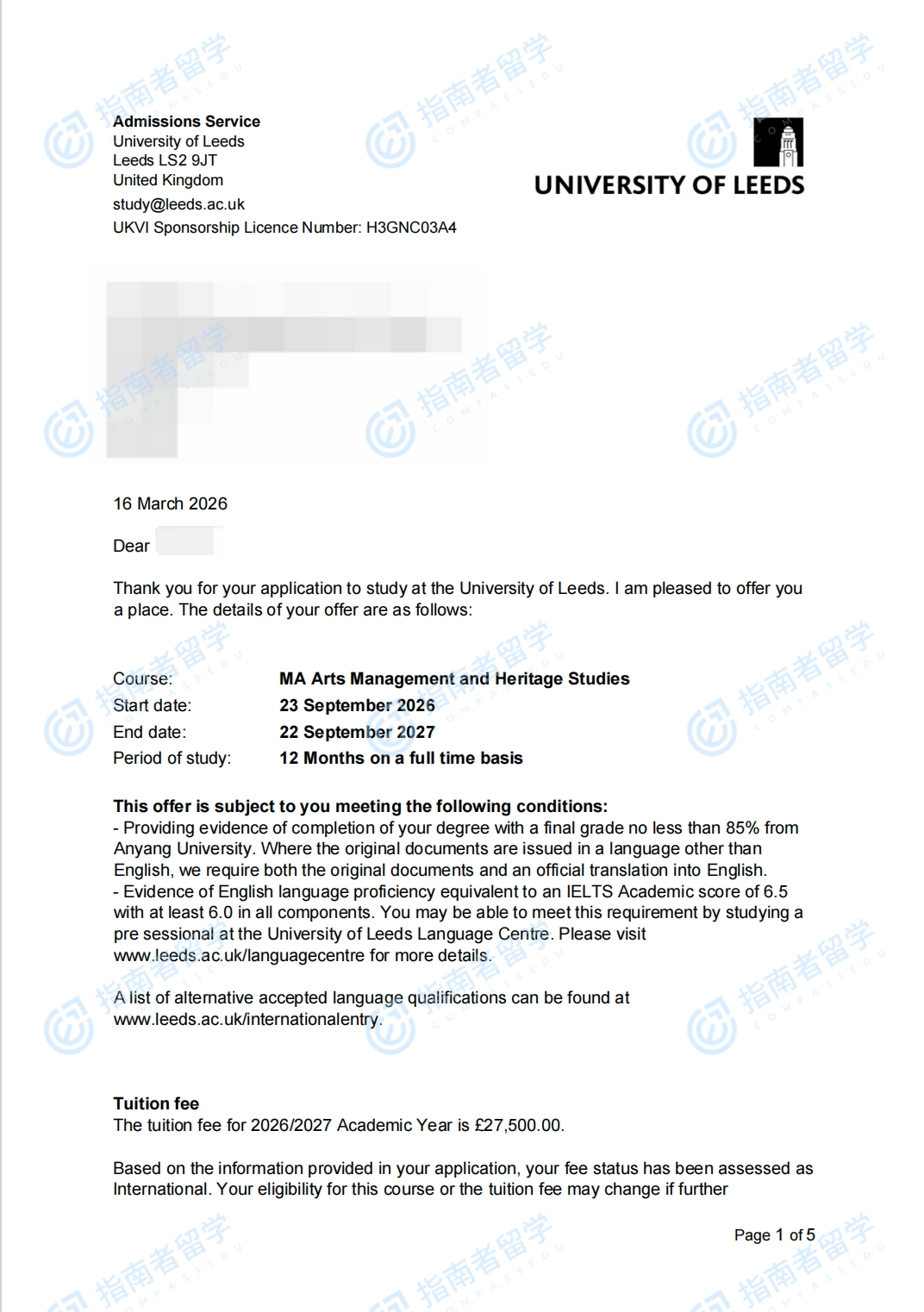 利兹大学艺术管理与遗产研究文学硕士研究生offer一枚