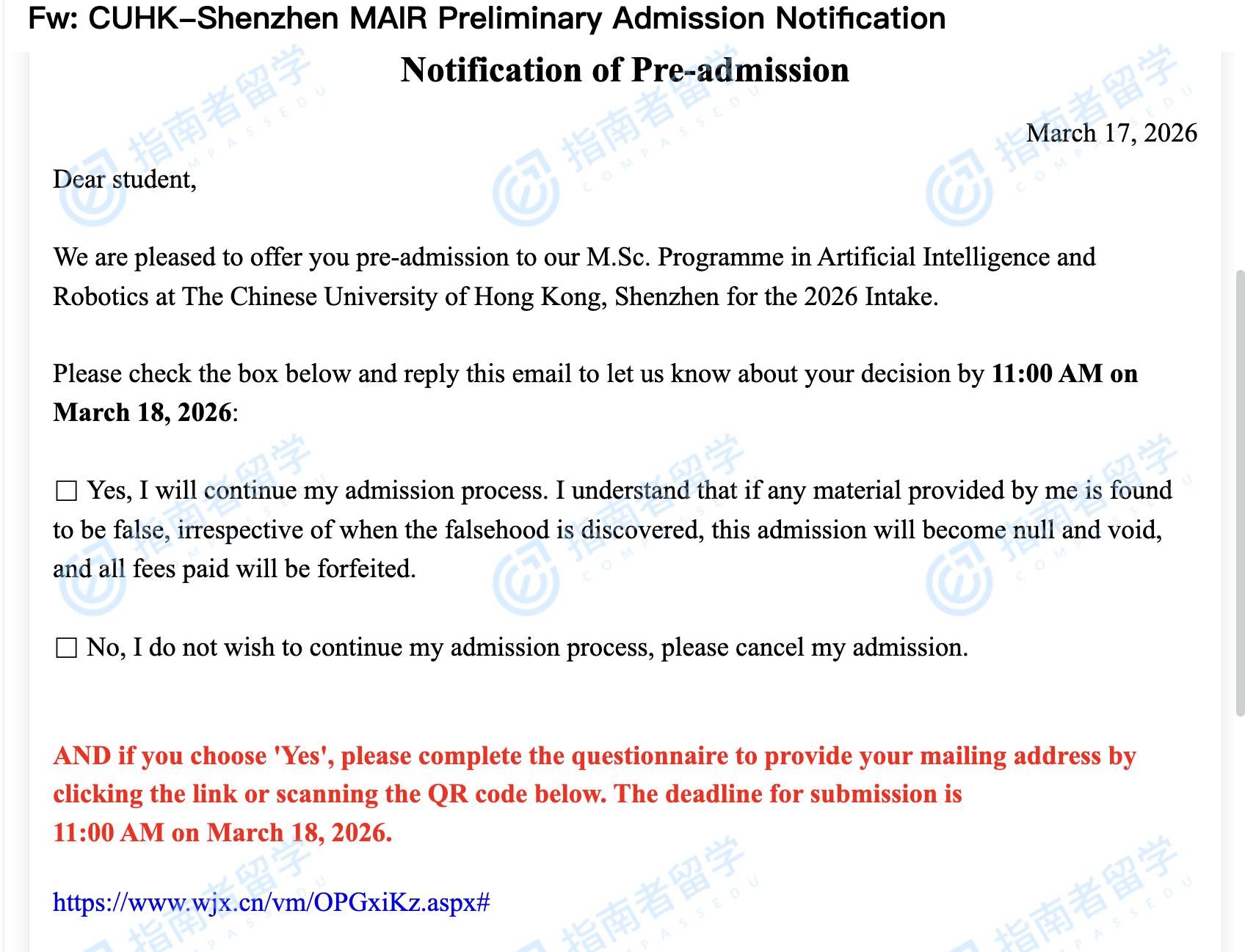香港中文大学人工智能与机器人理学硕士(CUHK-Shenzhen)研究生offer一枚