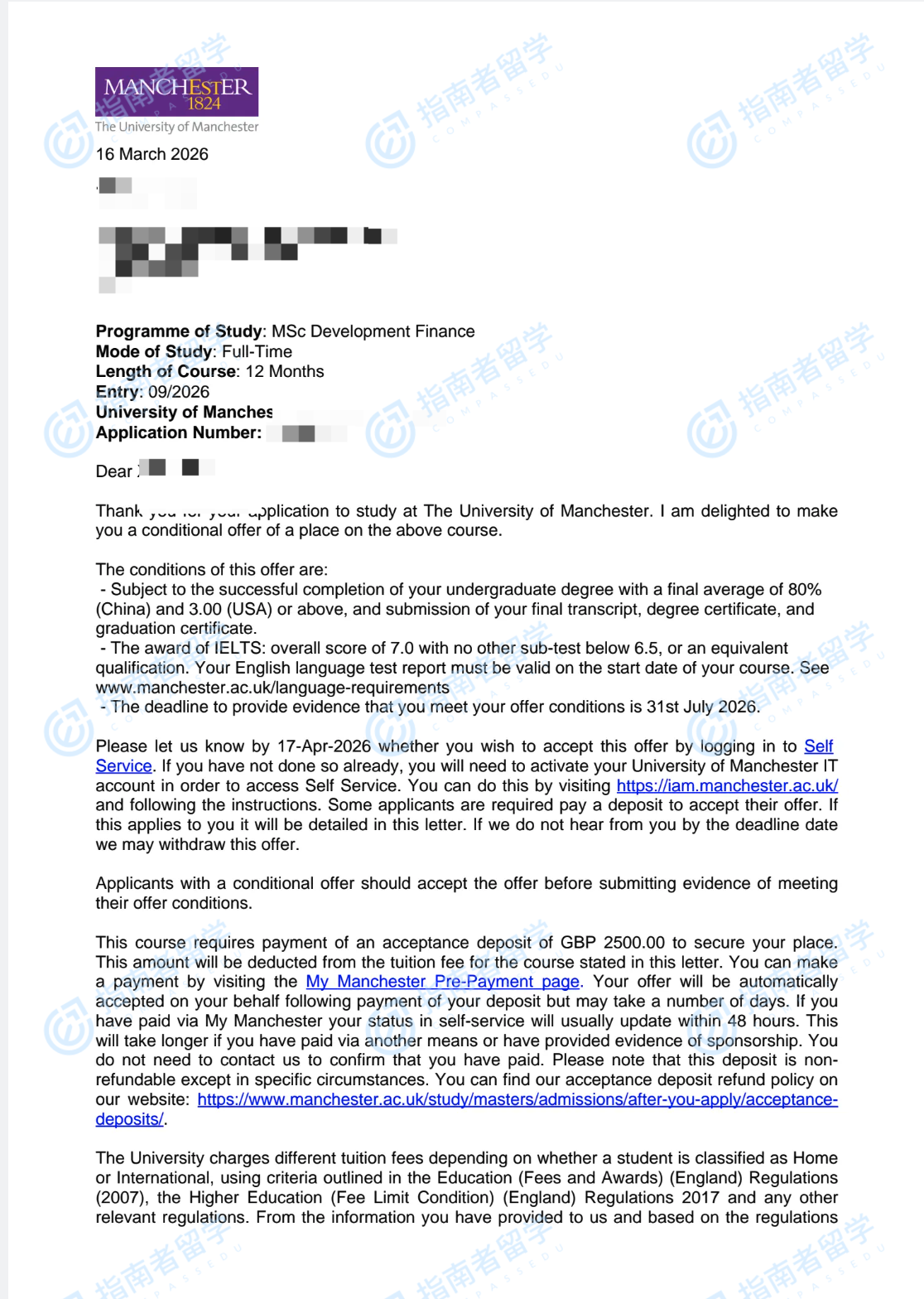 曼彻斯特大学发展金融学理学硕士研究生offer一枚