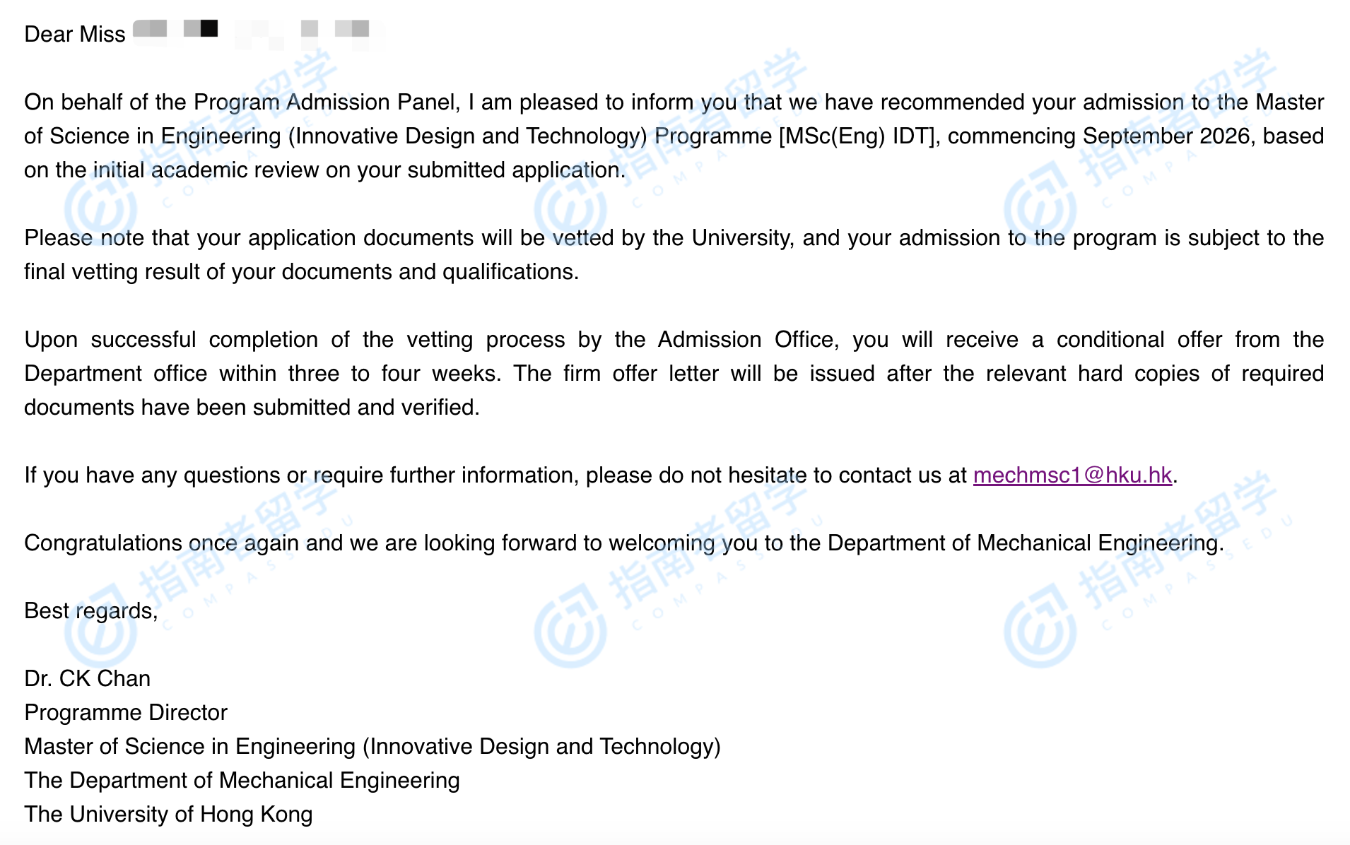 香港大学创新设计与科技(工程)理学硕士研究生offer一枚