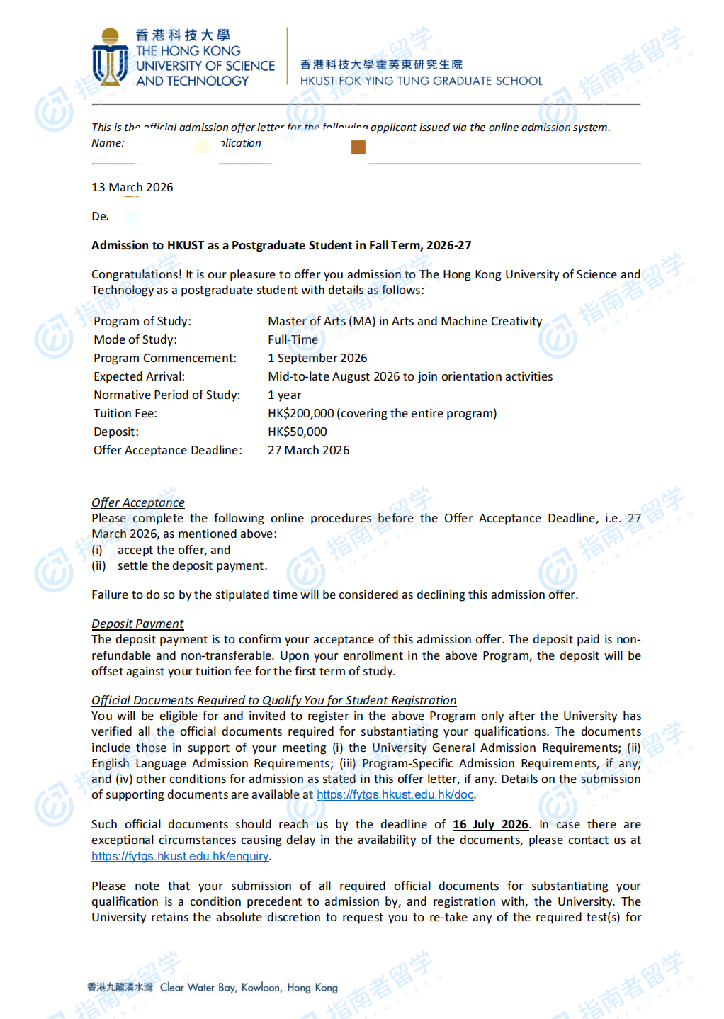 香港科技大学艺术与机器创造力文学硕士研究生offer一枚