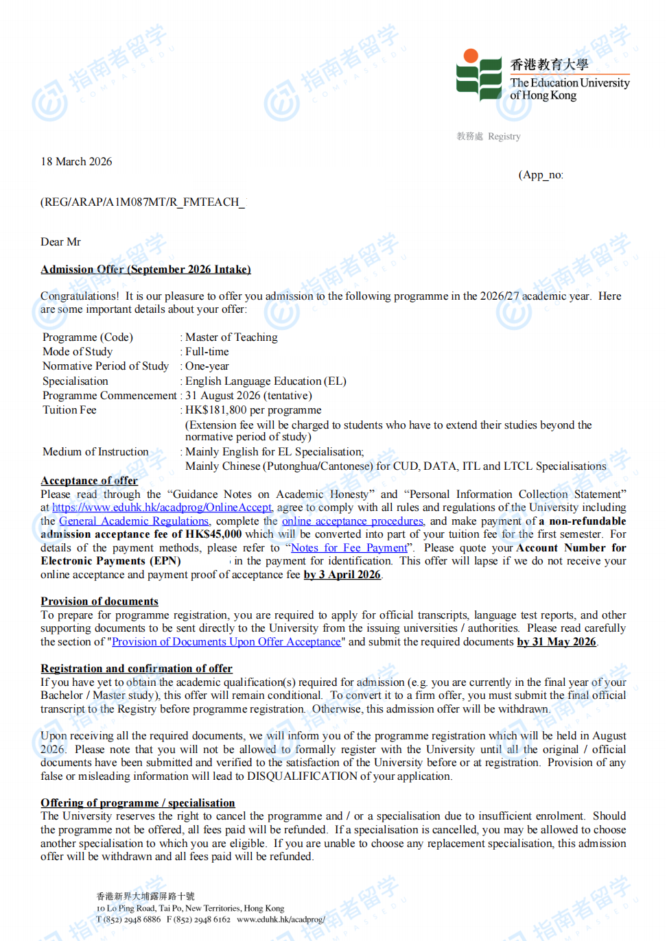 香港教育大学教学硕士研究生offer一枚