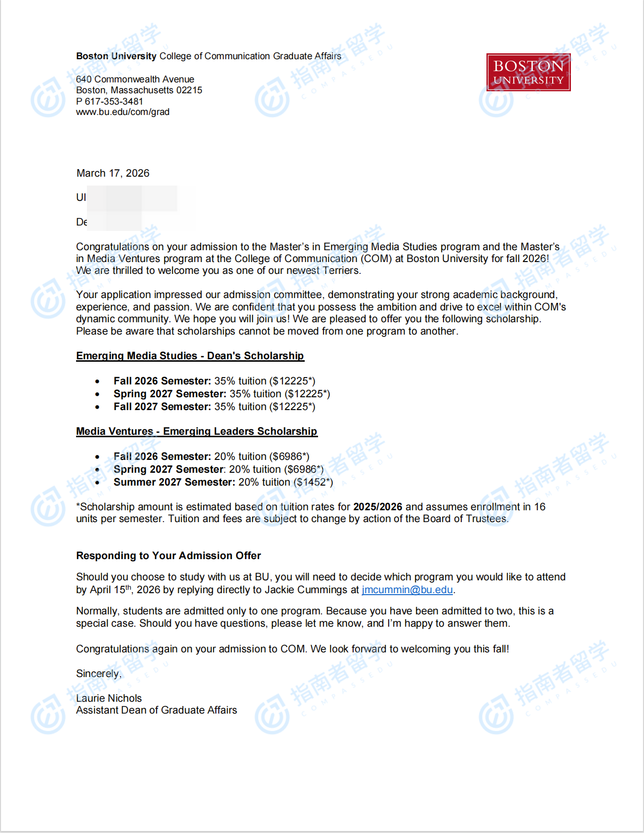 波士顿大学新兴媒体研究硕士研究生offer一枚