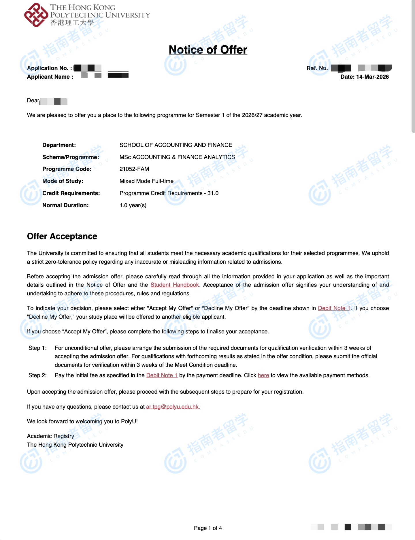 香港理工大学会计及金融分析理学硕士研究生offer一枚
