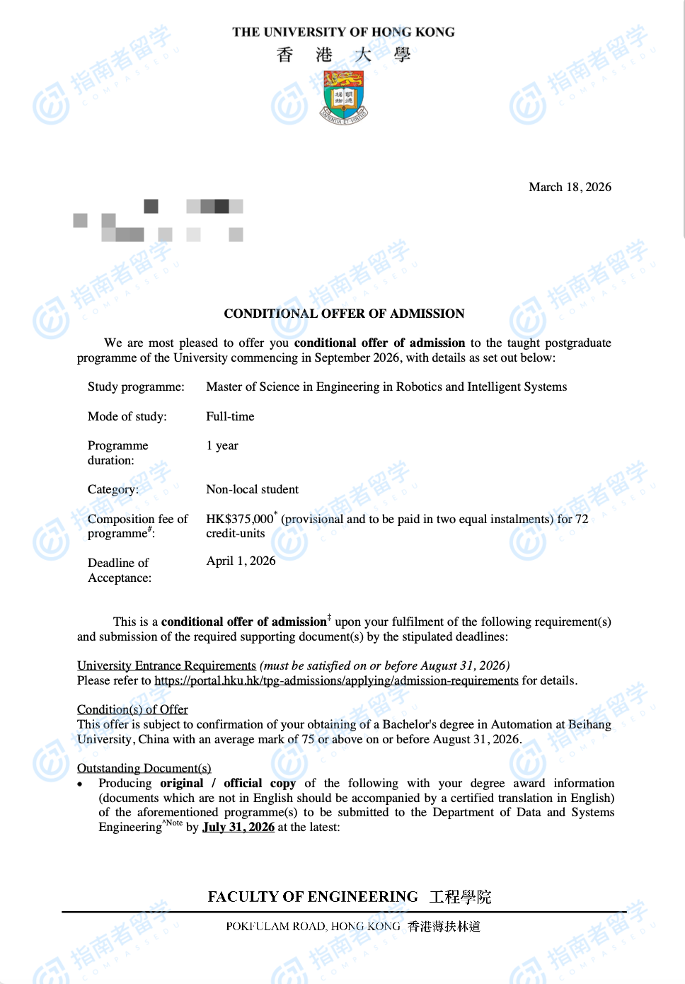 香港大学机器人与智能系统(工程)理学硕士研究生offer一枚
