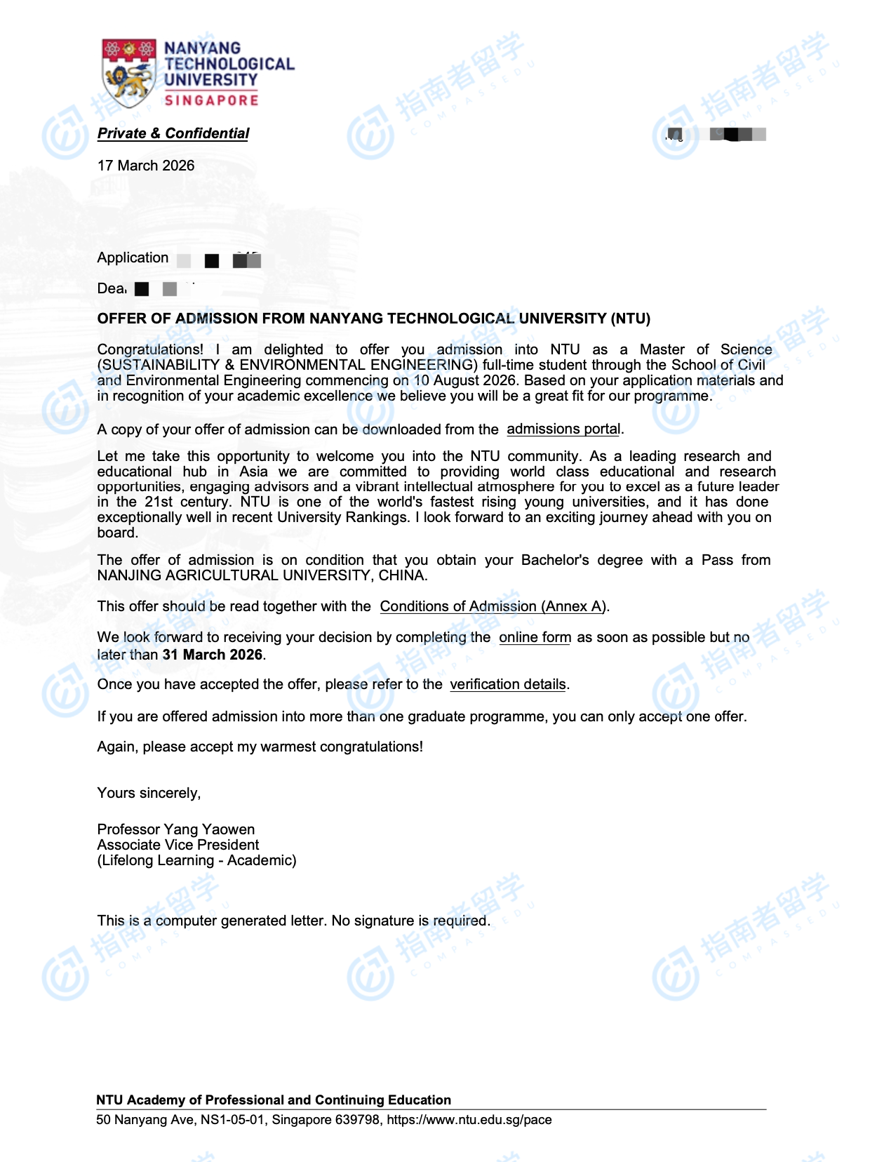 南洋理工大学可持续发展与环境工程理学硕士研究生offer一枚