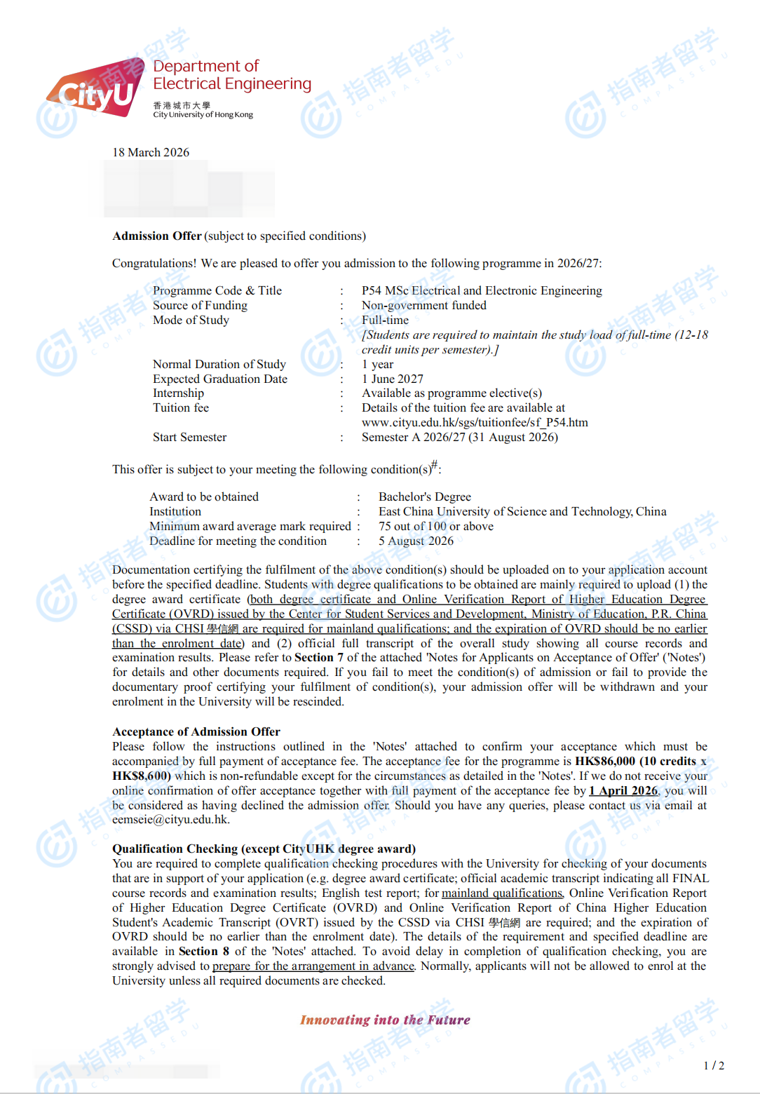 香港城市大学电机与电子工程学理学硕士研究生offer一枚