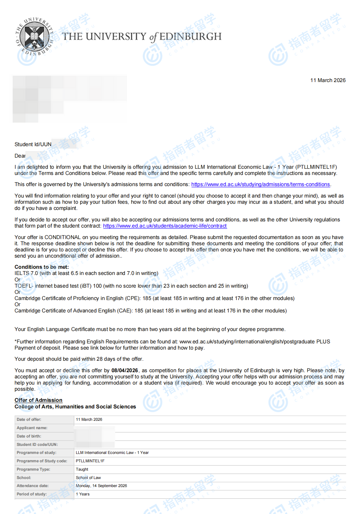 爱丁堡大学国际经济法法学硕士研究生offer一枚