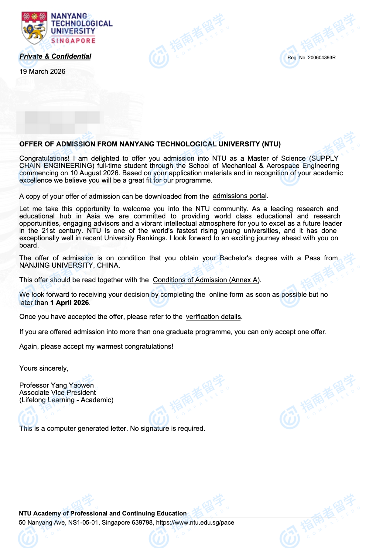 南洋理工大学供应链工程理学硕士研究生offer一枚