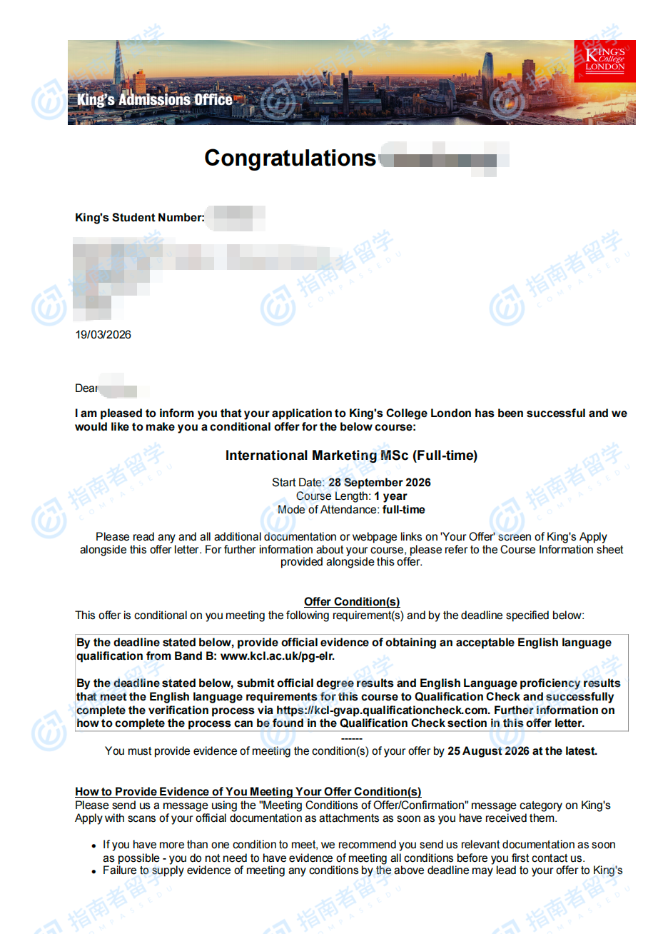伦敦大学国王学院国际营销理学硕士研究生offer一枚
