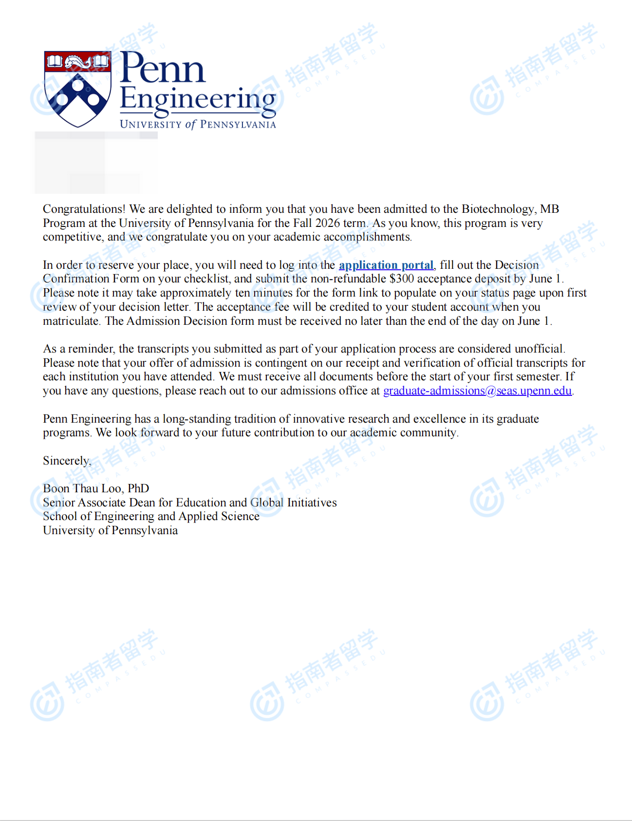 宾夕法尼亚大学生物技术硕士研究生offer一枚