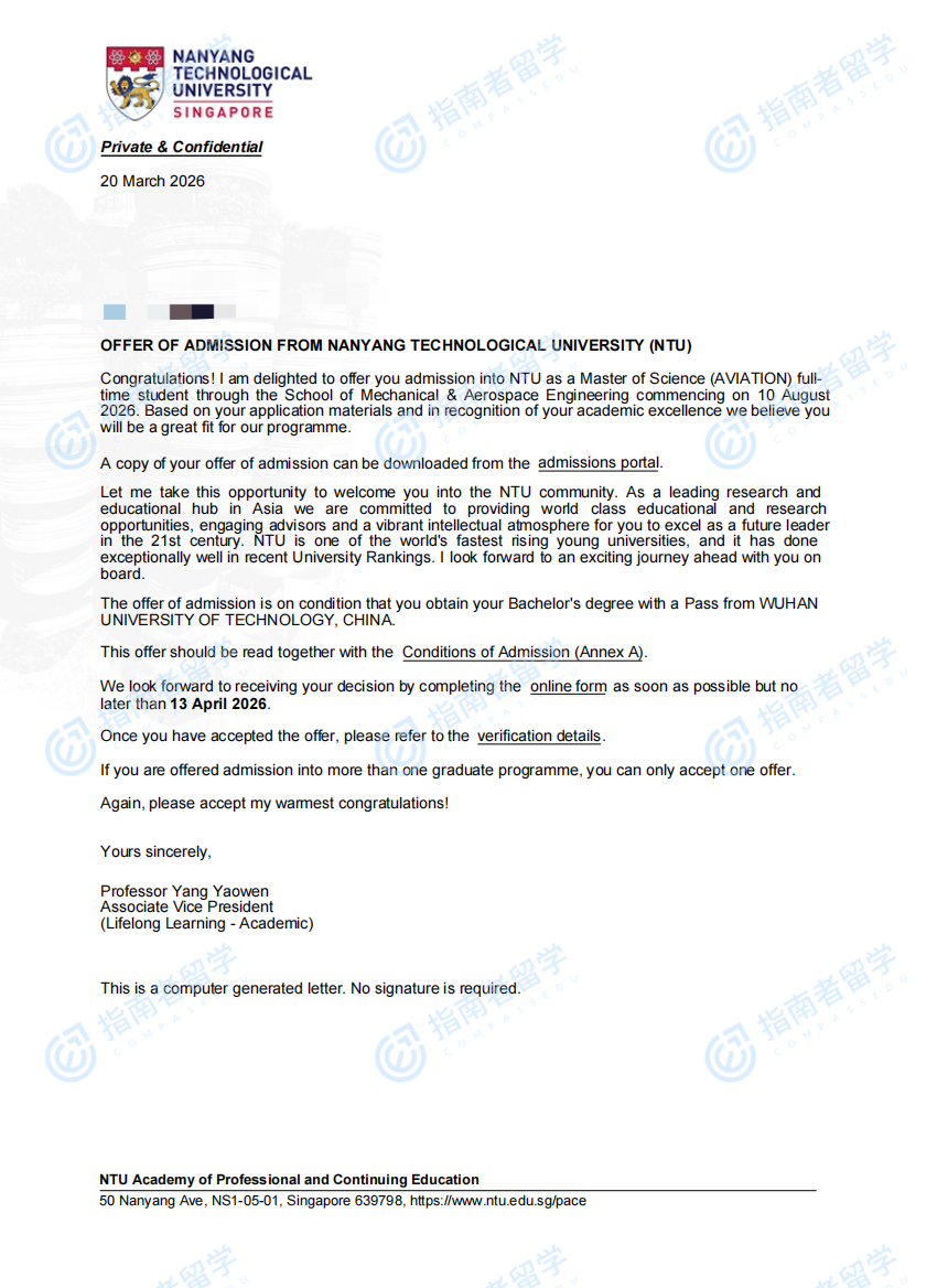 南洋理工大学航空理学硕士研究生offer一枚