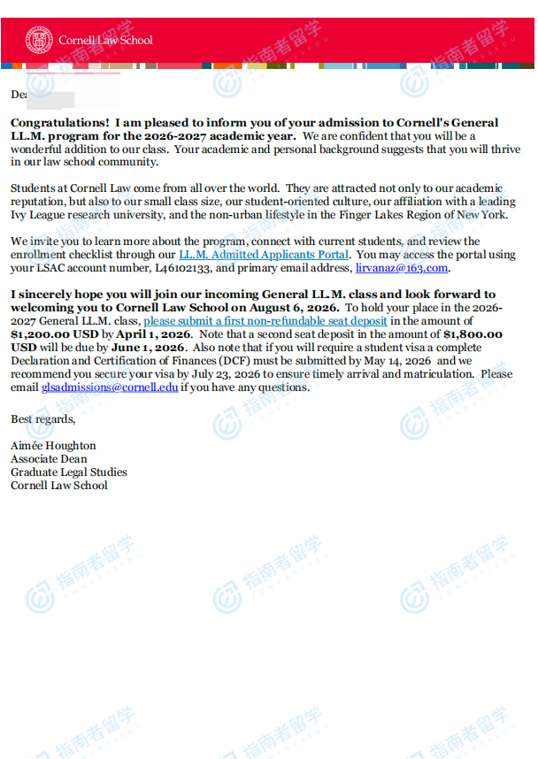 康奈尔大学法学硕士研究生offer一枚