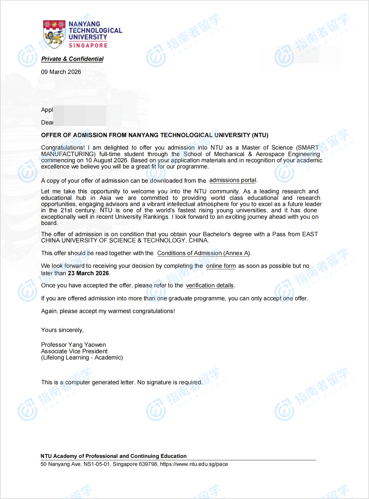 南洋理工大学智能制造理学硕士研究生offer一枚