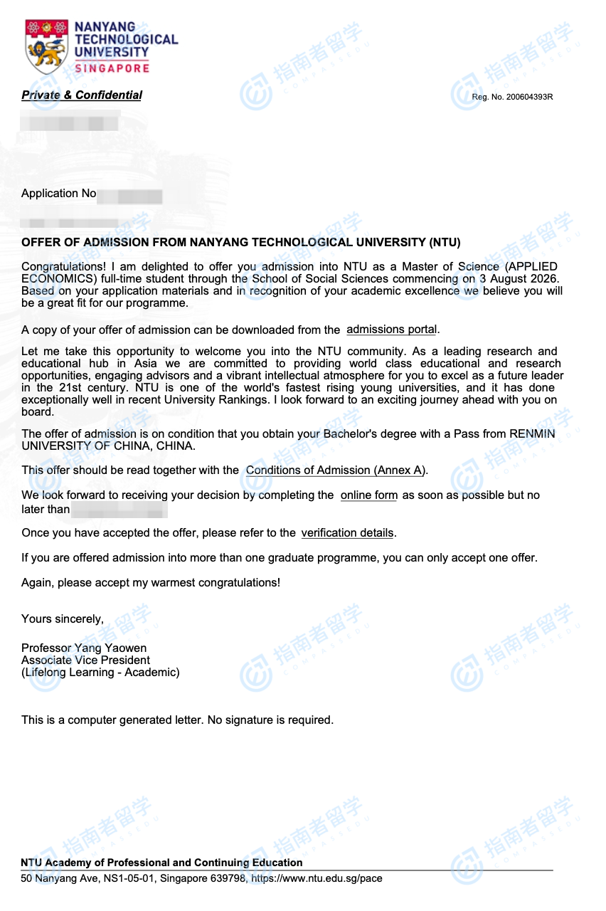 南洋理工大学应用经济学理学硕士研究生offer一枚