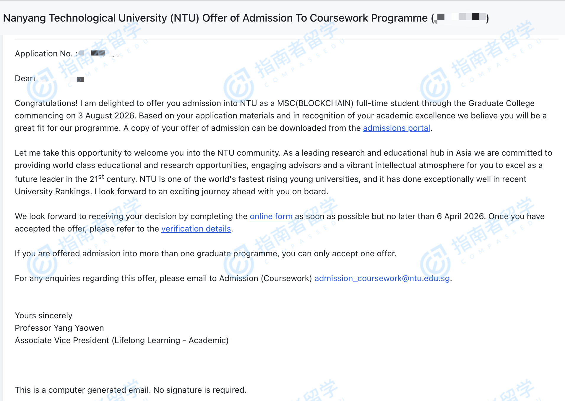 南洋理工大学区块链理学硕士研究生offer一枚