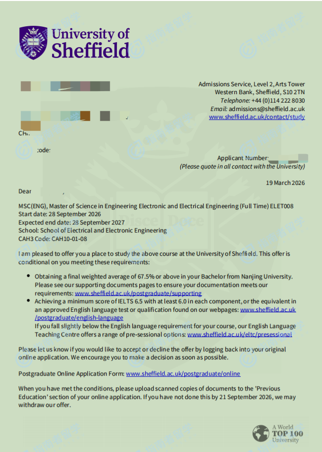 谢菲尔德大学电子与电气工程(工程)理学硕士研究生offer一枚