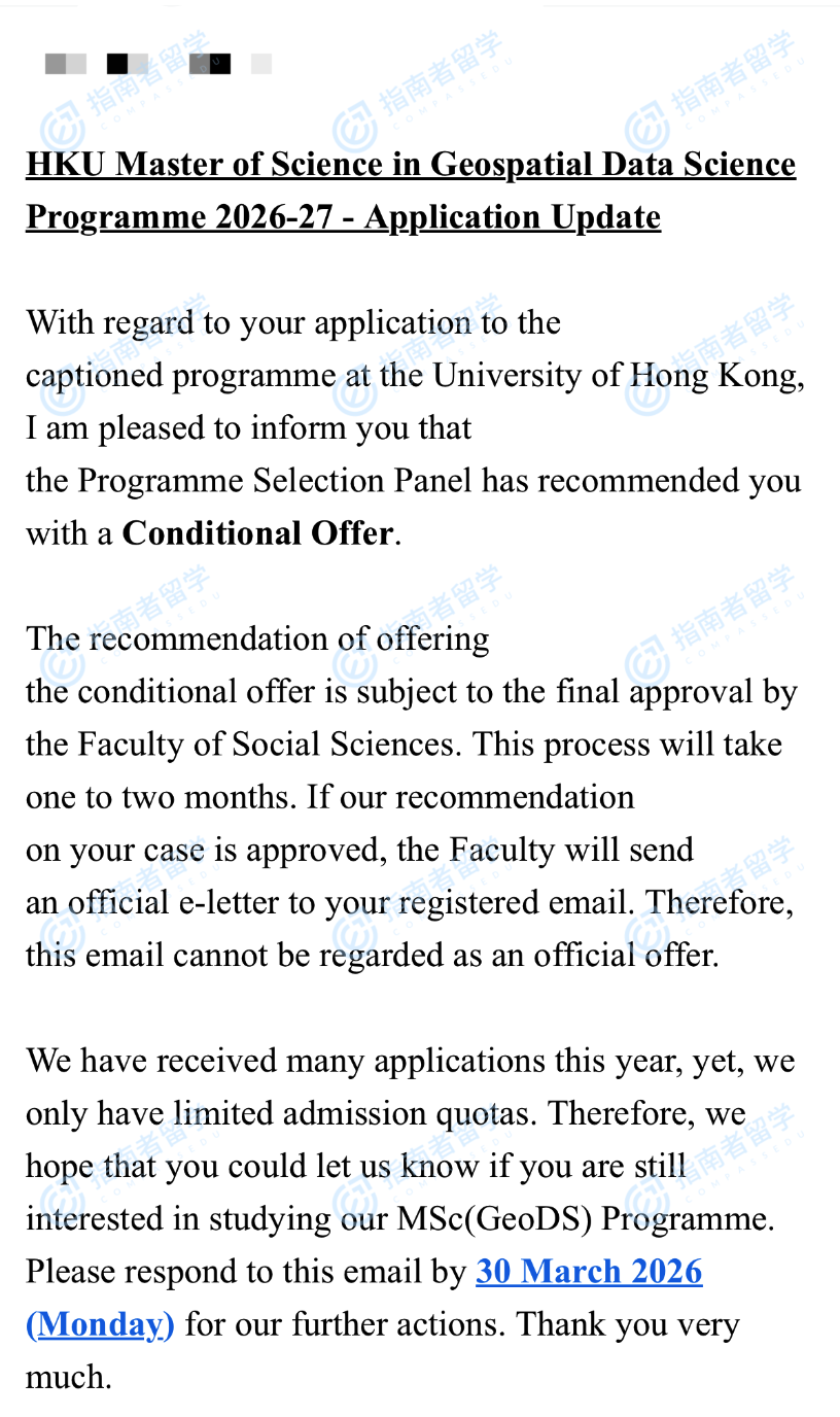 香港大学地理空间数据科学理学硕士研究生offer一枚