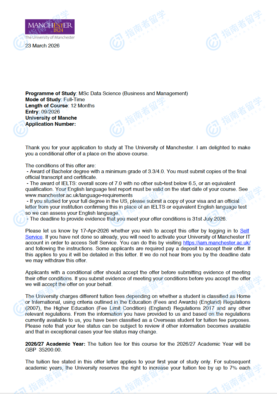 曼彻斯特大学数据科学(商业与管理)理学硕士研究生offer一枚