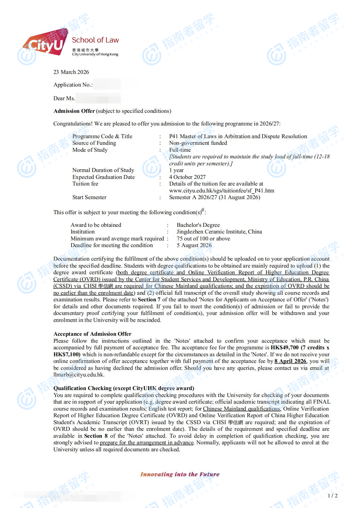 香港城市大学仲裁与争议解决法学硕士研究生offer一枚