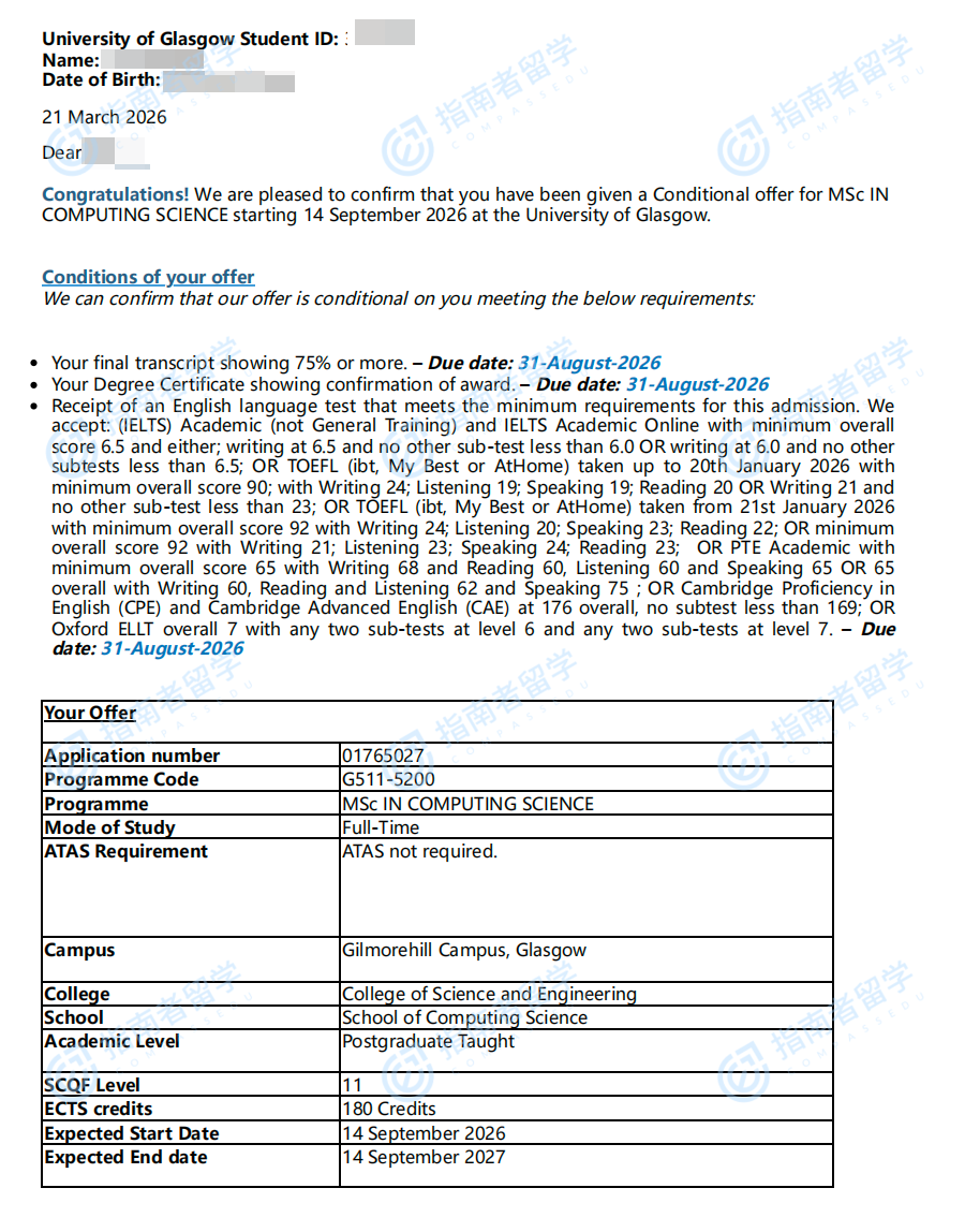 格拉斯哥大学计算科学理学硕士研究生offer一枚
