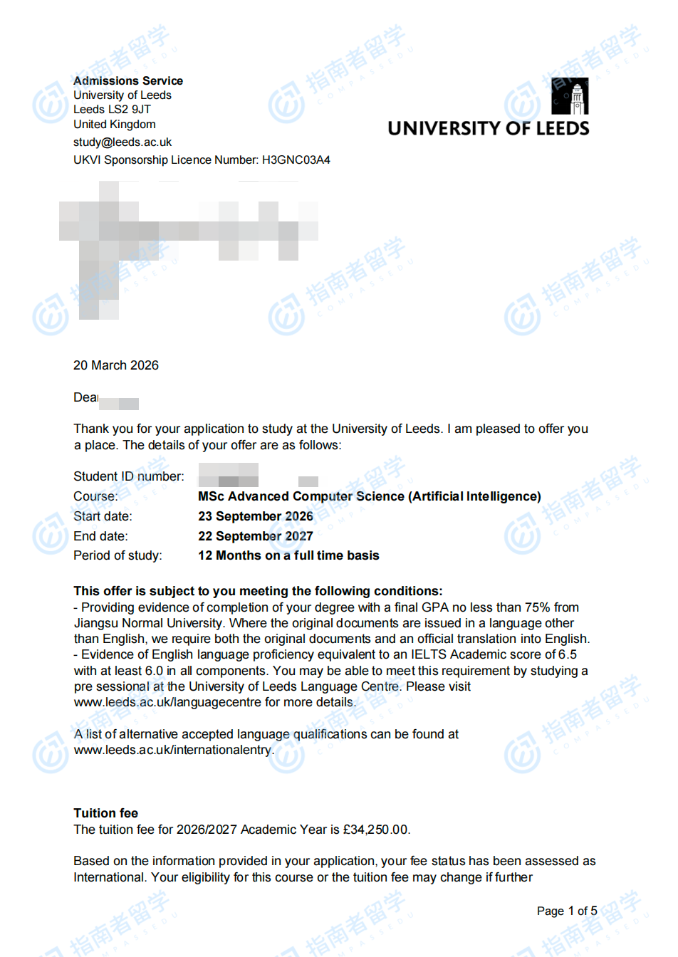 利兹大学高级计算机科学(人工智能)理学硕士研究生offer一枚