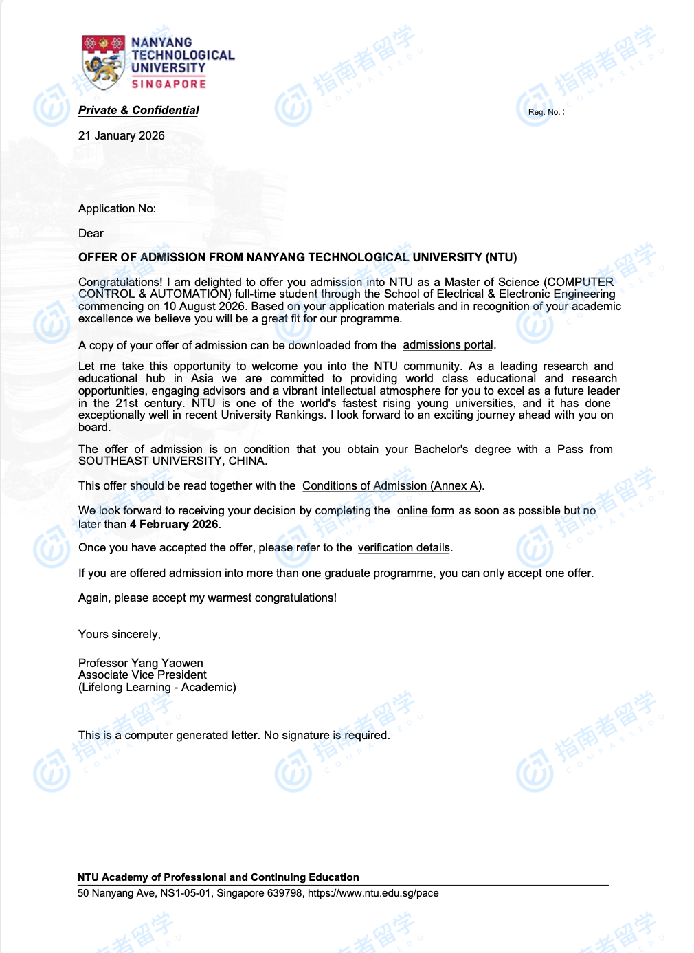 南洋理工大学计算机控制与自动化理学硕士研究生offer一枚