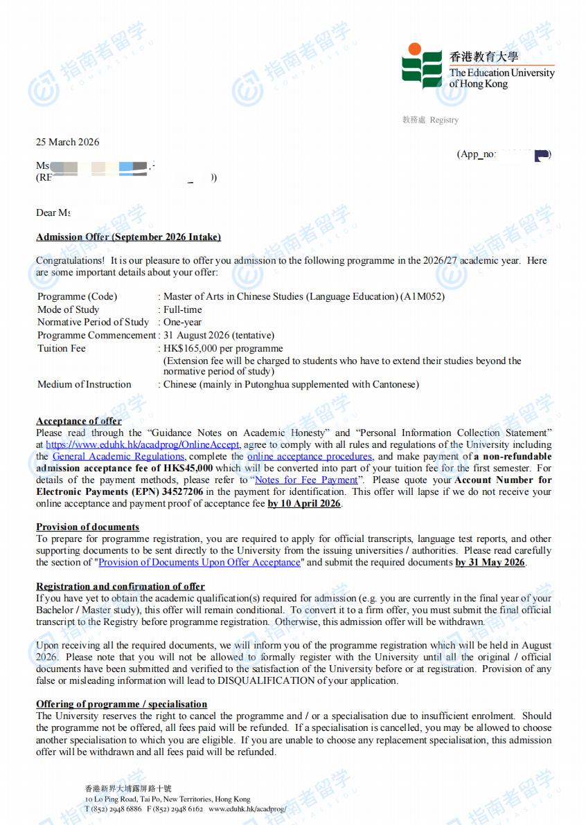 香港教育大学中文研究文学硕士(语文教育)研究生offer一枚