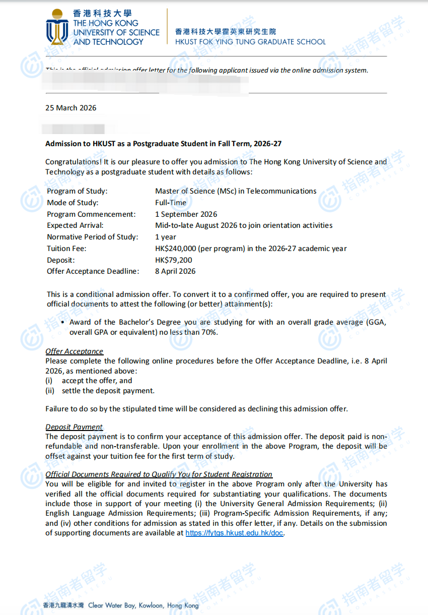 香港科技大学电信学理学硕士研究生offer一枚