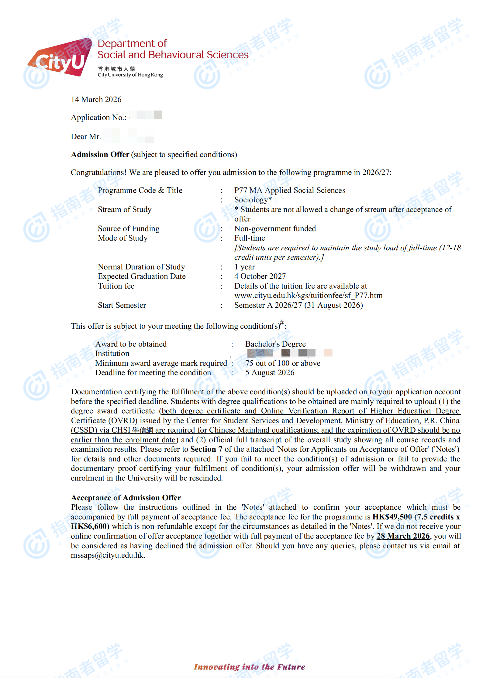 香港城市大学应用社会科学文学硕士研究生offer一枚