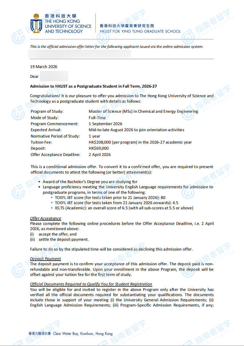 香港科技大学化学与能源工程理学硕士研究生offer一枚