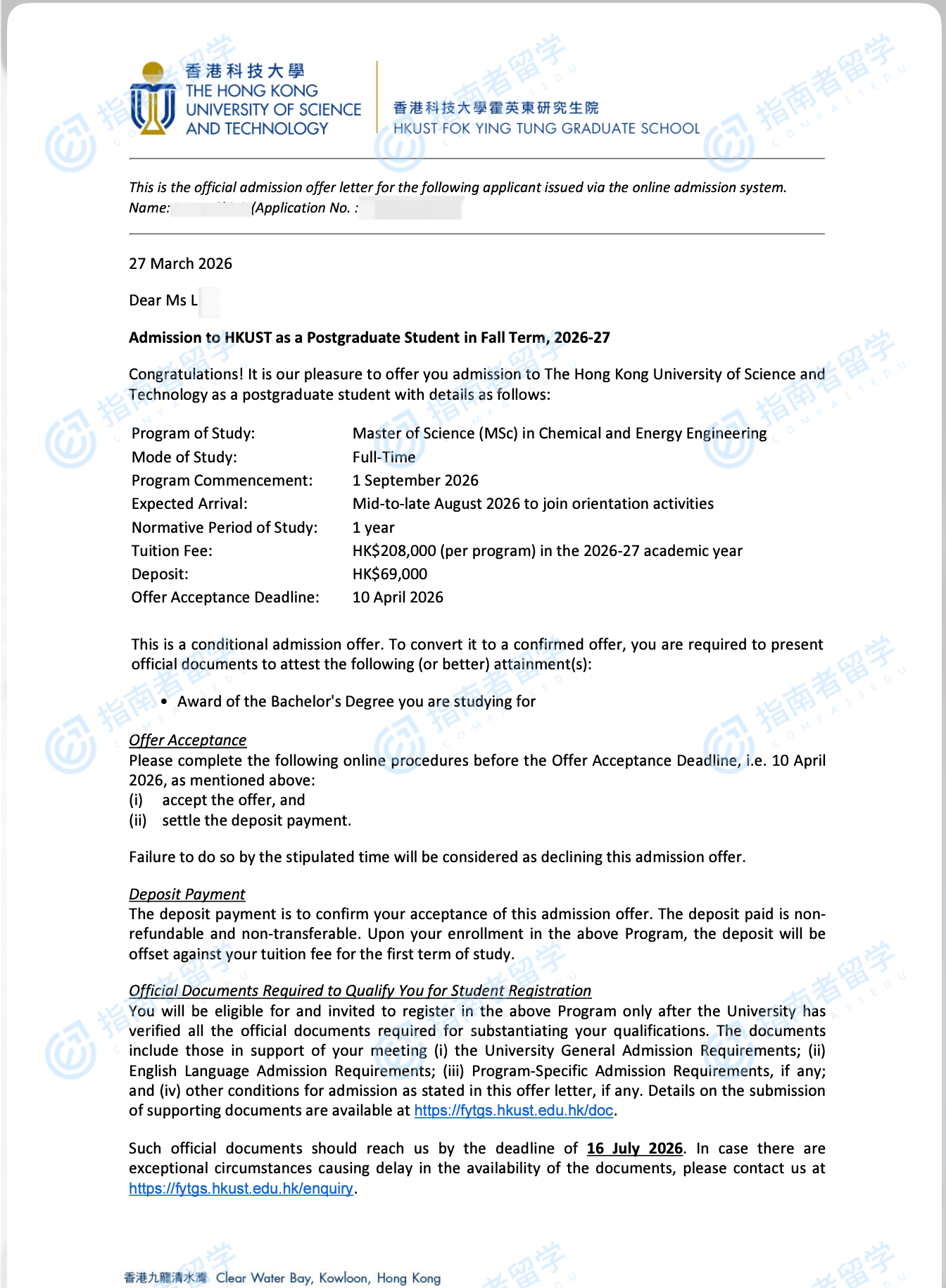 香港科技大学化学与能源工程理学硕士研究生offer一枚