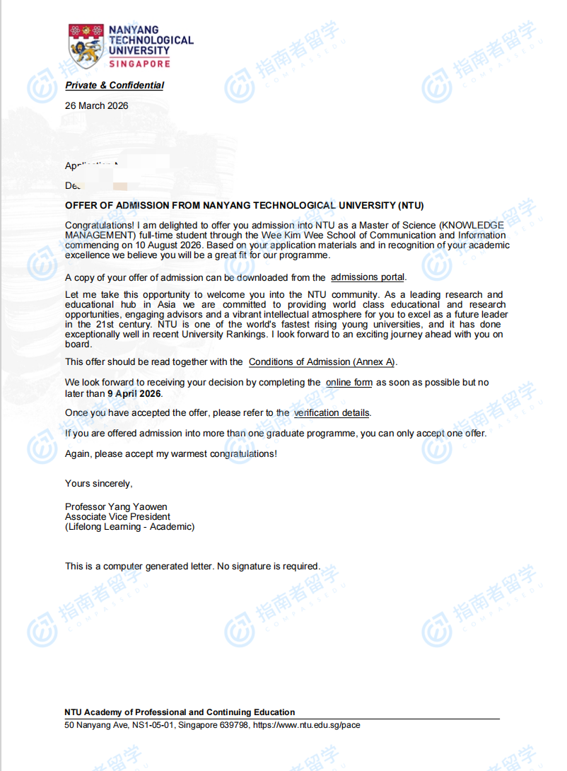 南洋理工大学知识管理理学硕士研究生offer一枚