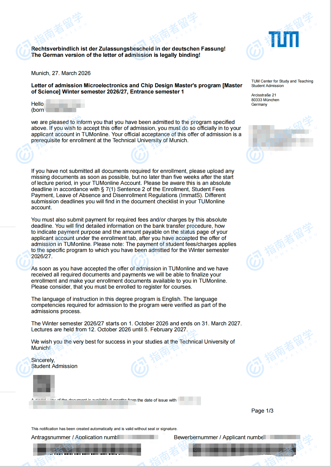 慕尼黑工业大学微电子与芯片设计理学硕士研究生offer一枚