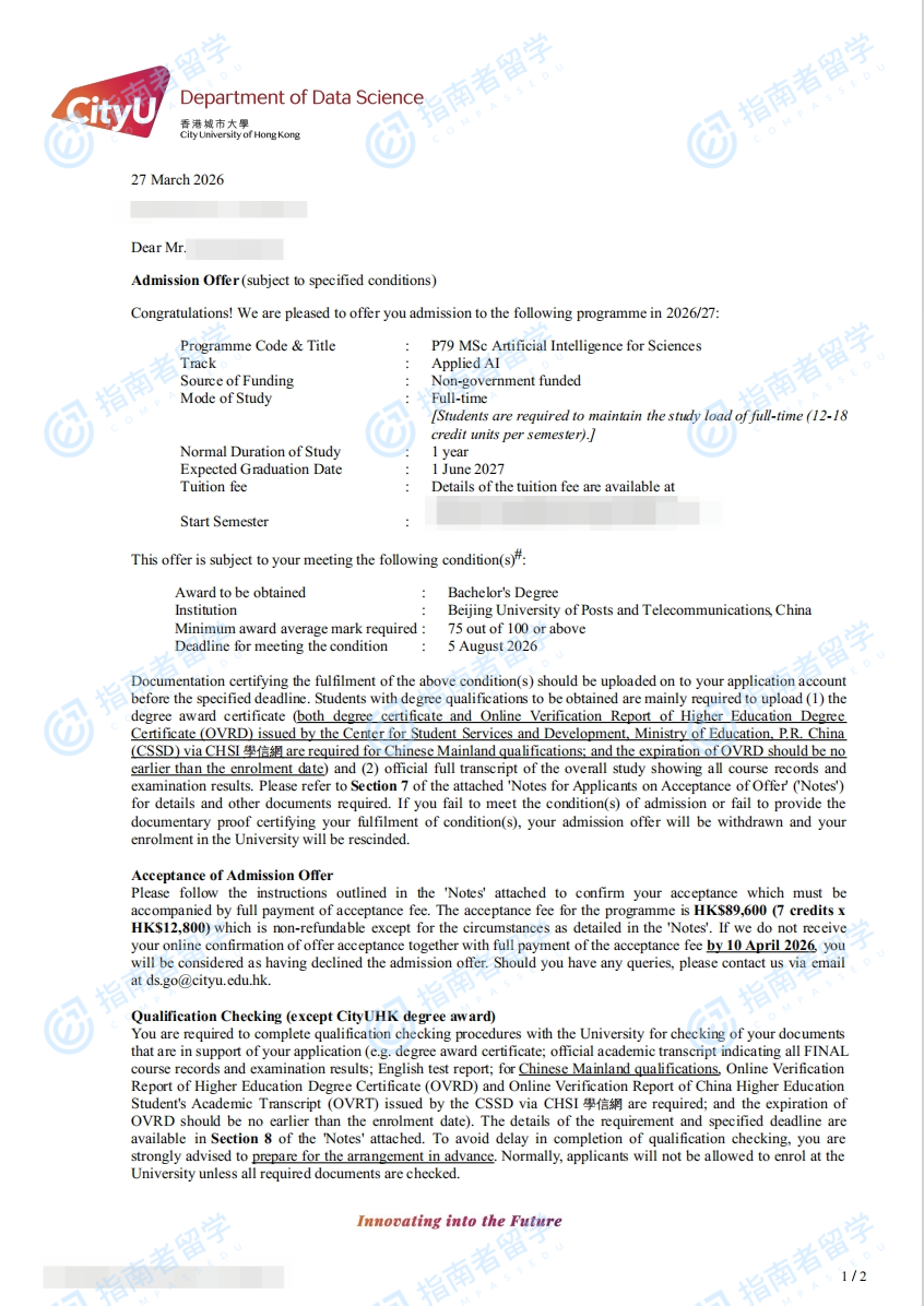 香港城市大学科学人工智能理学硕士研究生offer一枚