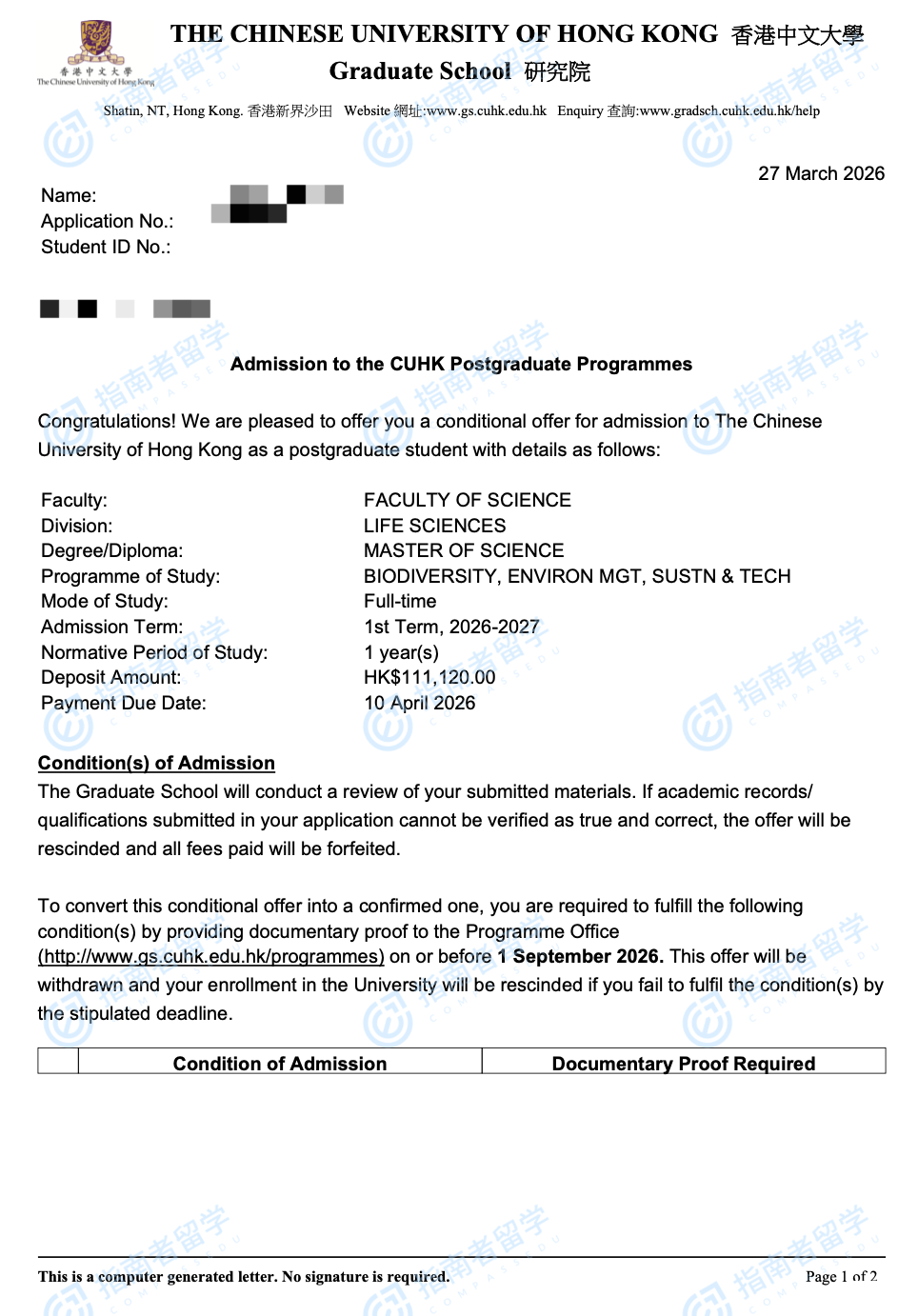 香港中文大学生物多样性、环境管理、可持续发展与技术理学硕士研究生offer一枚