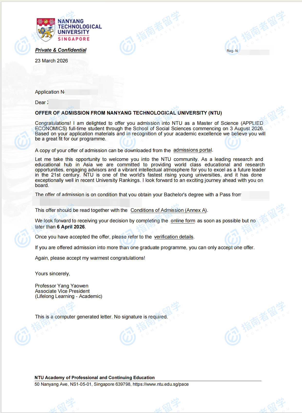 南洋理工大学应用经济学理学硕士研究生offer一枚