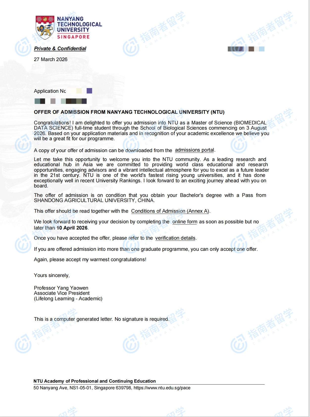 南洋理工大学生物医学数据科学理学硕士研究生offer一枚