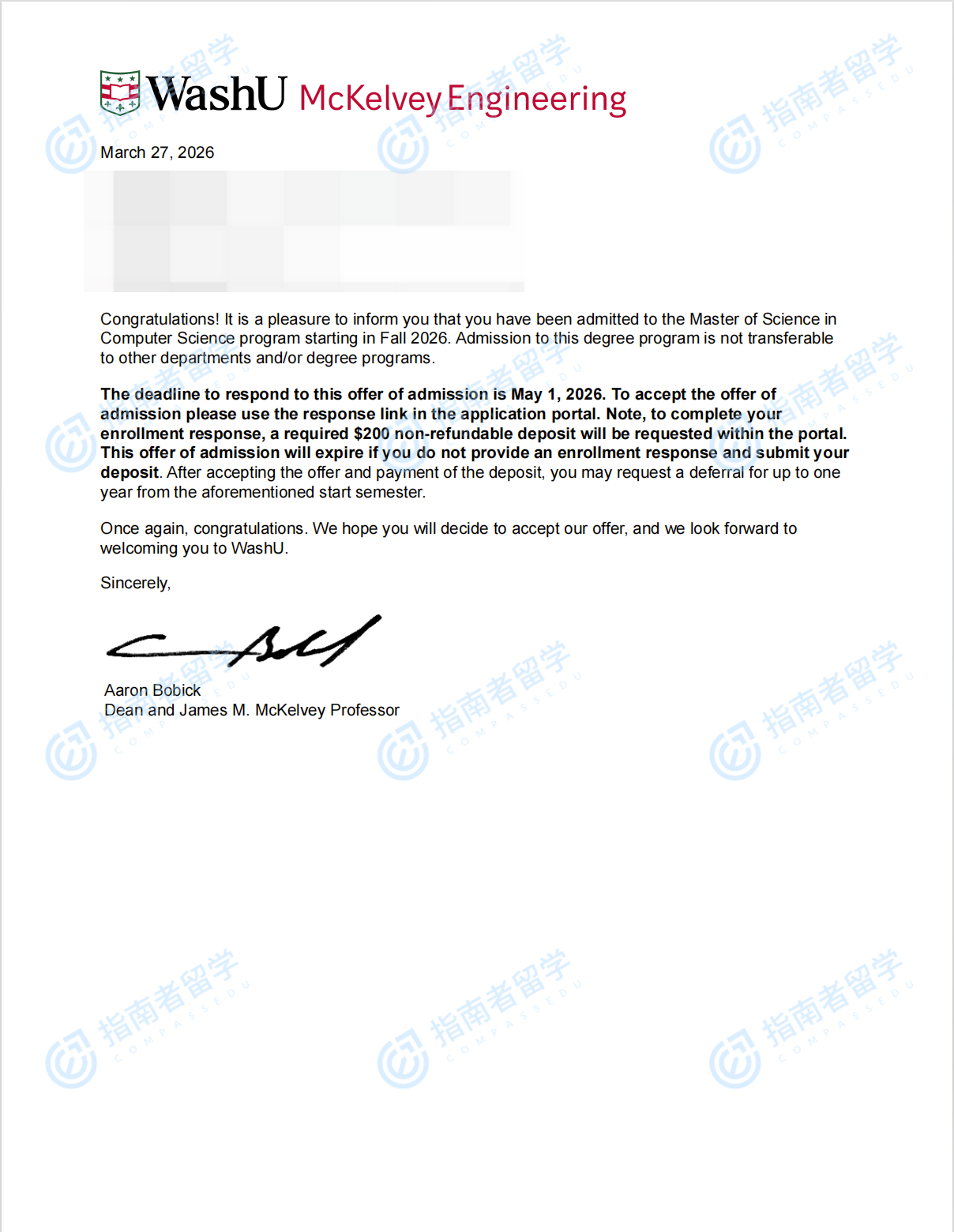 圣路易斯华盛顿大学计算机科学理学硕士研究生offer一枚