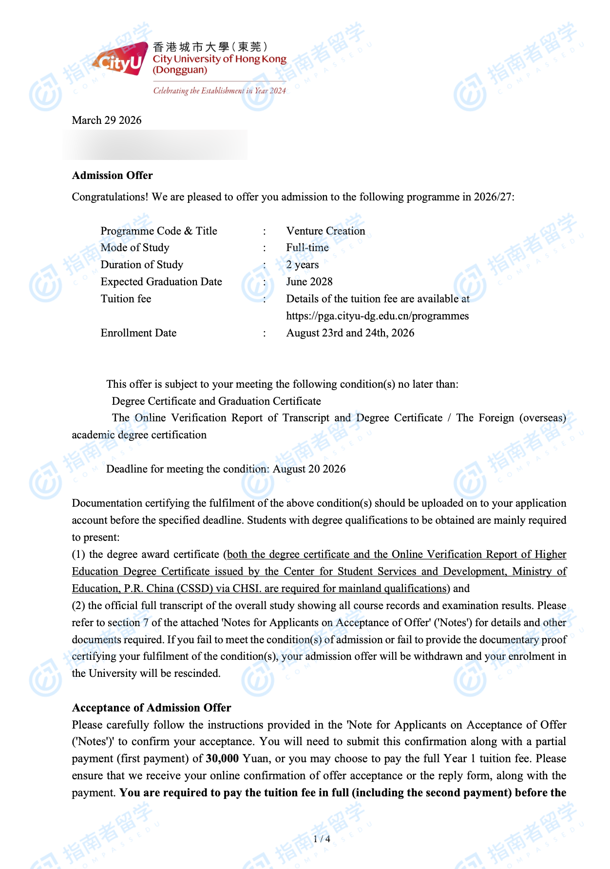 香港城市大学创新创业理学硕士(CityU-DG)研究生offer一枚