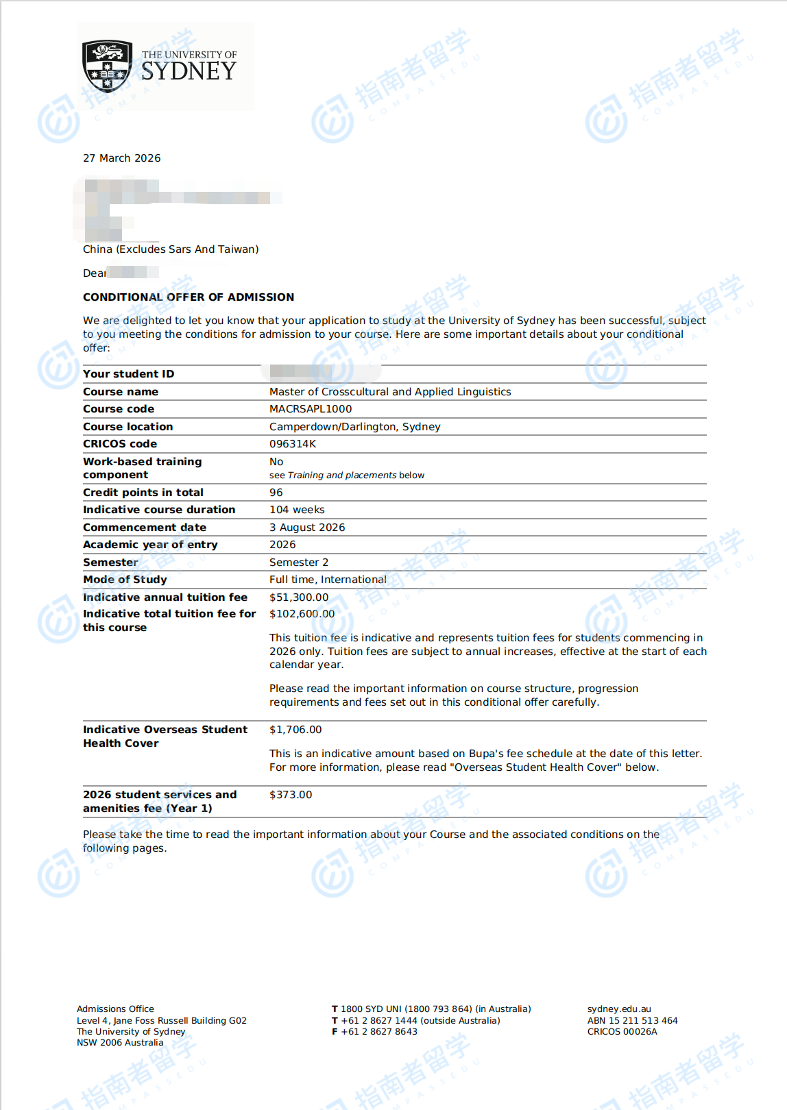 悉尼大学跨文化与应用语言学硕士研究生offer一枚