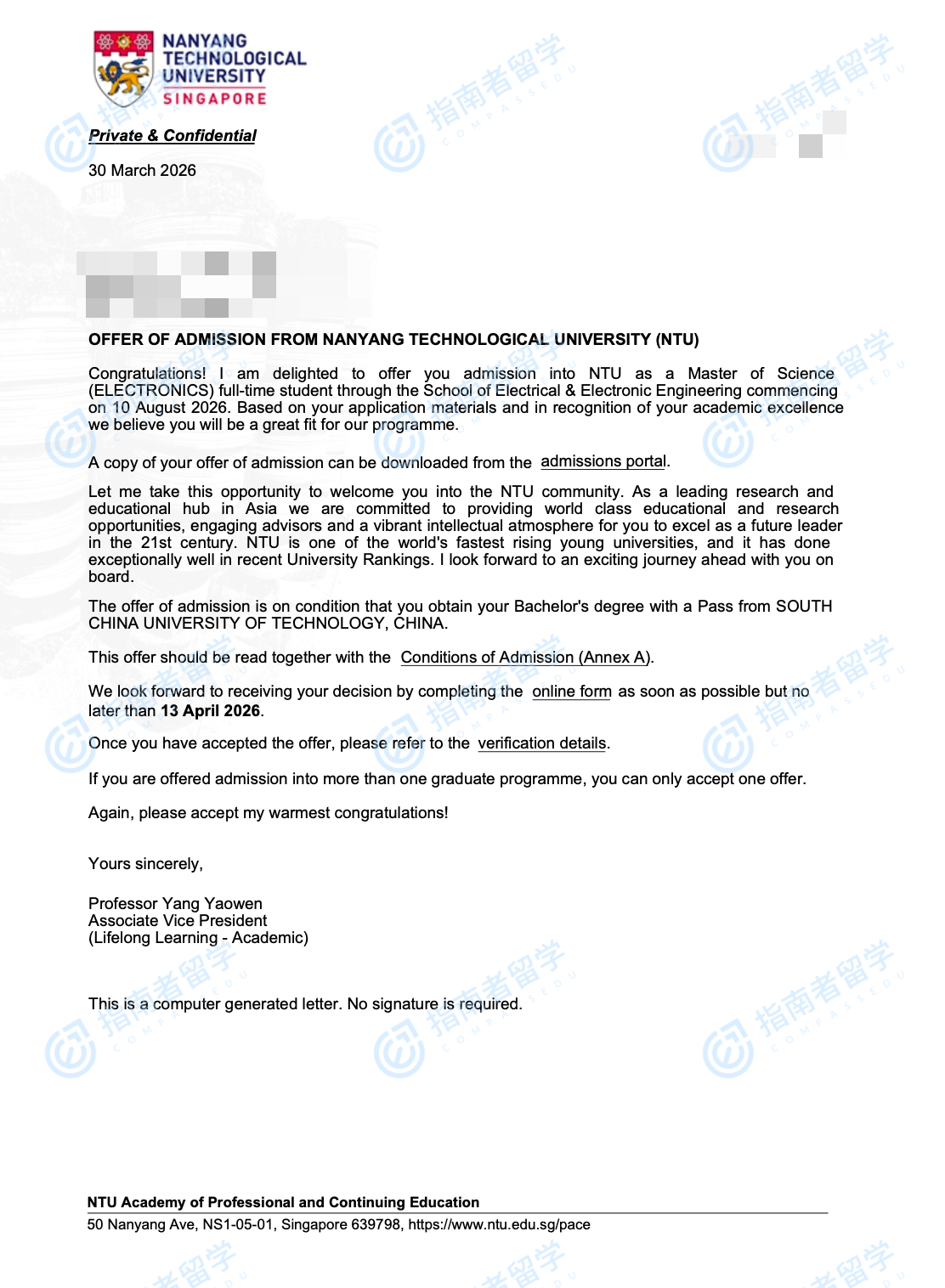 南洋理工大学电子工程方向录取报告