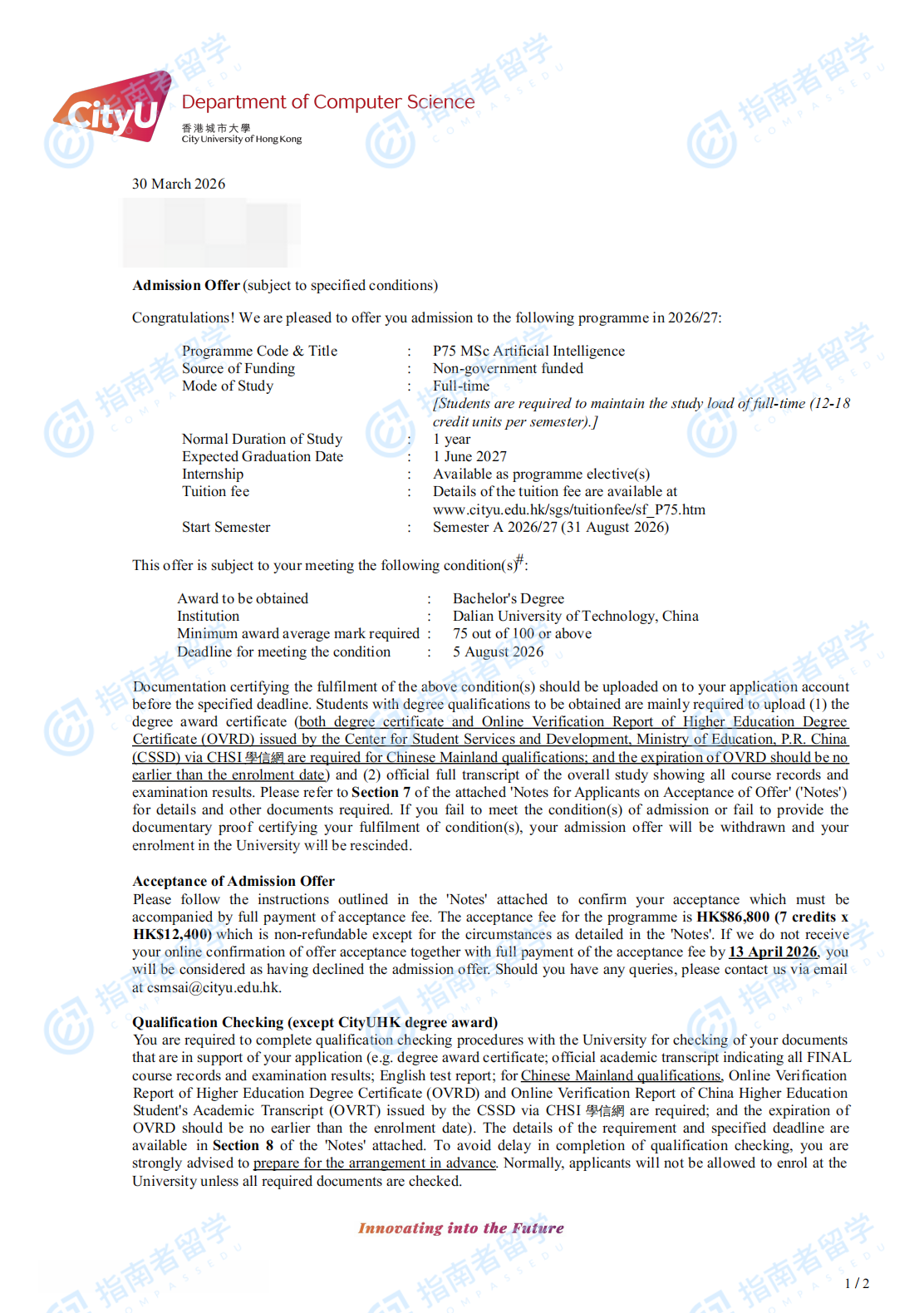 香港城市大学人工智能理学硕士研究生offer一枚