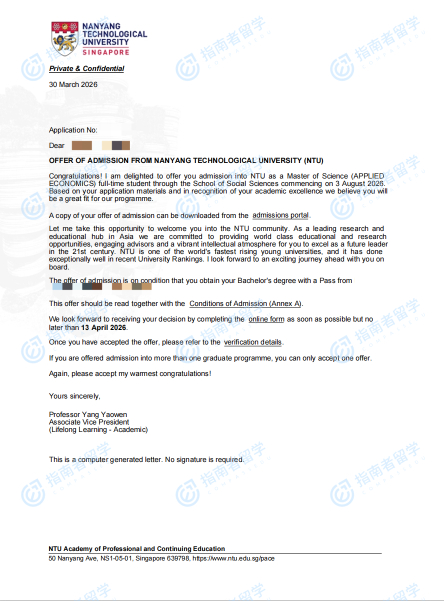南洋理工大学应用经济学理学硕士研究生offer一枚