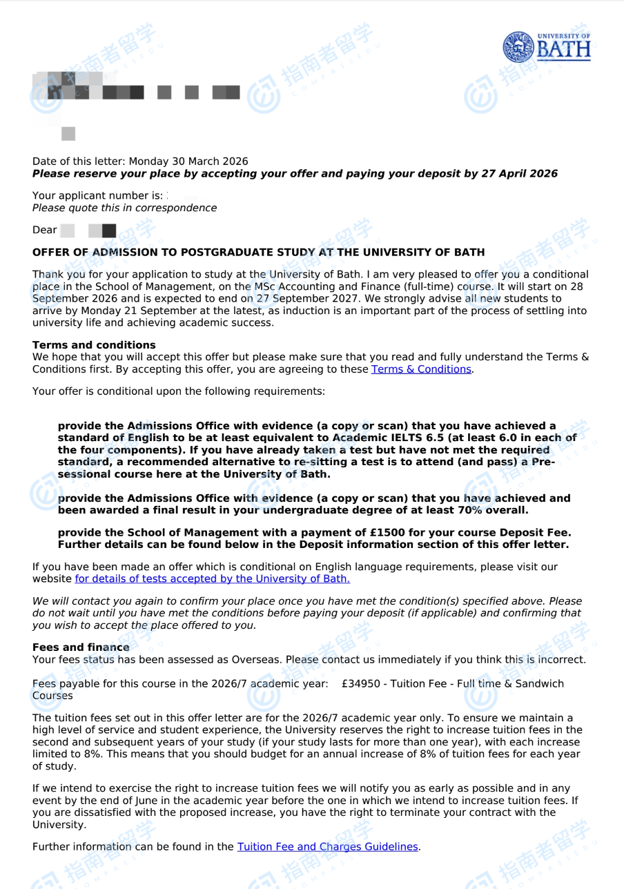 巴斯大学会计与金融理学硕士研究生offer一枚