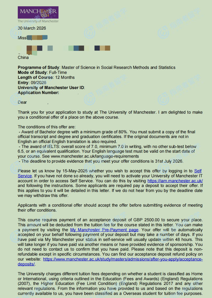曼彻斯特大学社会研究方法与统计学理学硕士研究生offer一枚