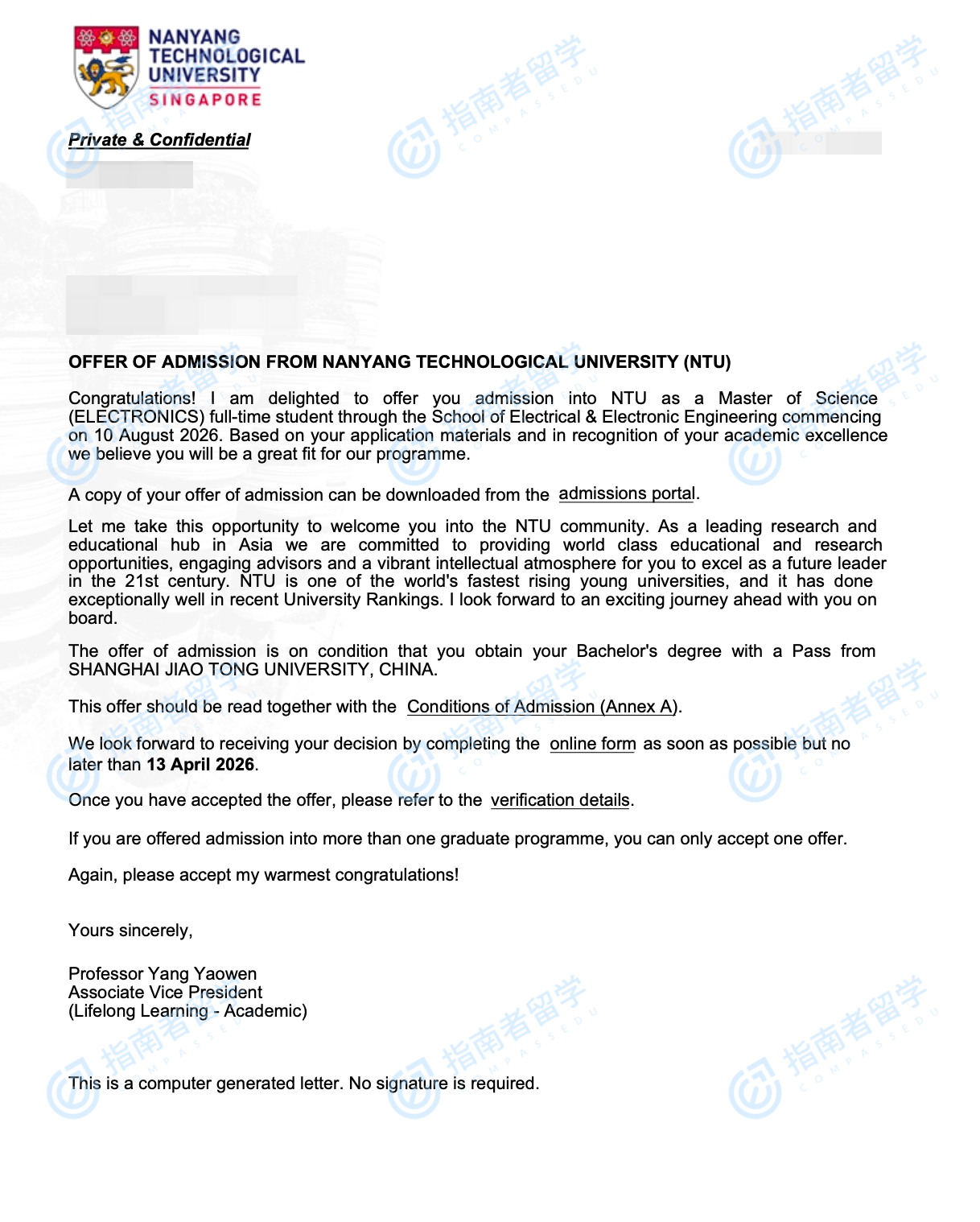 南洋理工大学电子工程方向录取报告