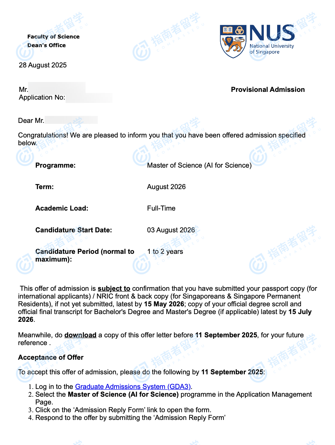 新加坡国立大学科学智能理学硕士研究生offer一枚